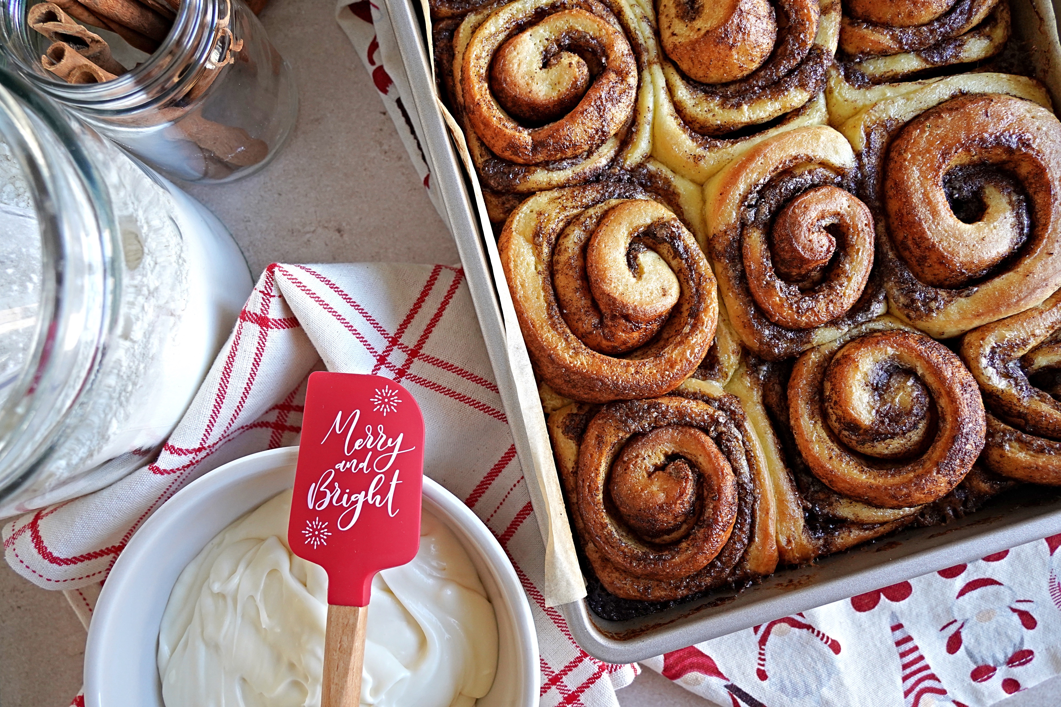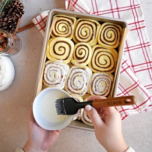 Having high-quality bakeware can help ensure that your baked goods are evenly cooked. This year, KSP has introduced some adorable new holiday patterns, including my personal favourite – gnomes! I used these towels for each dough rise, and these spatulas to apply the cinnamon filling and frosting. The OXO cake pan is both durable and non-stick, ensuring that the rolls are baked to perfection!