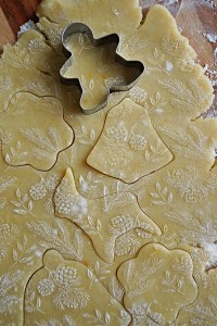 I used both cookie cutters and this set to cut out the shapes. To get a good print on the cookies, roll out your chilled dough using a standard rolling pin then press down on the embossed rolling pin as you move across the dough. The outcome is magical!