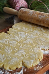 I used both cookie cutters and this set to cut out the shapes. To get a good print on the cookies, roll out your chilled dough using a standard rolling pin then press down on the embossed rolling pin as you move across the dough. The outcome is magical!