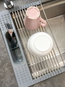 The KSP SINKSMART Roll-Up Dish Drying Rack W/Utensil Caddy is a smart solution for drying dishes and utensils over your sink, keeping water where it should be and freeing up precious counter space. Not to mention, it looks great!