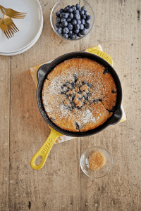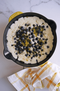 6. Remove the skillet and pour in the batter. Top with the blueberry mixture. Sprinkle with a pinch of turbinado sugar (optional).